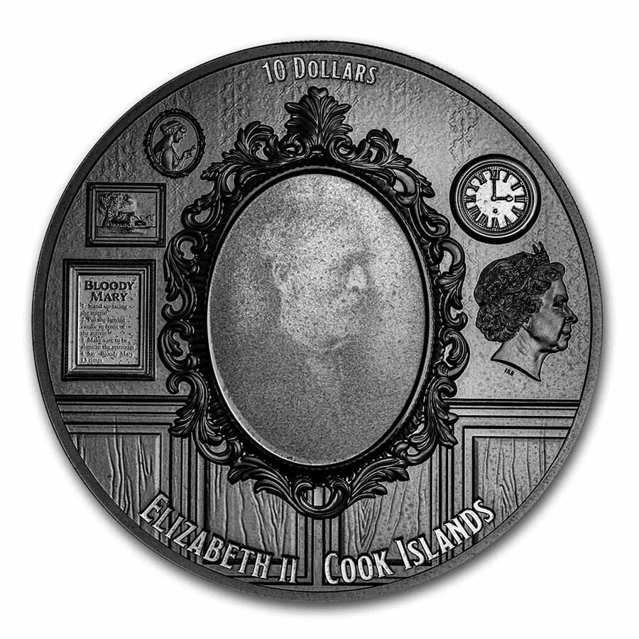 - Obverse: In the center is a mirror with a ghostly like appearance of Freelan Oscar Stanley. To the right is s a profile portrait of Her Majesty Queen Elizabeth II. Other images include a clock, an old farm house and instructions for Bloody Mary, which gives you directions to see the face in the mirror.