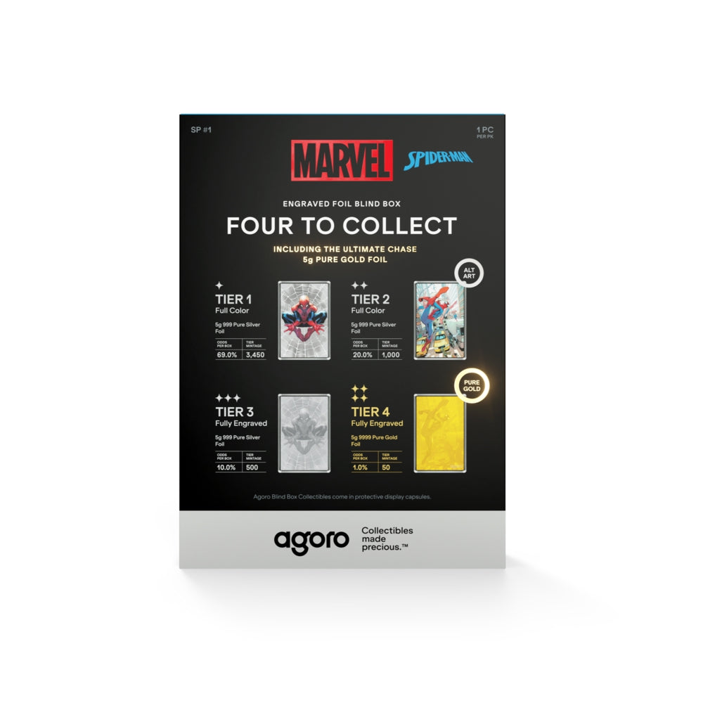 Each precious metal foil features officially licensed Spider-Man artwork, expertly crafted in 5g of 999 pure silver or 9999 pure gold, and sealed inside the Blind Box.